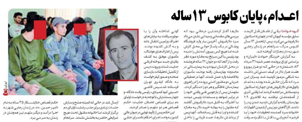 به گزارش خبرگزاری هرانا روزنامه ایران روز گذشته گزارش داد که یکی از عاملان قتل کارمند سابق مؤسسه کیهان که در چهارراه استانبول دلارفروشی میکرد، پس ازتحمل ۱۳ سال کابوس مرگ، سرانجام در زندان رجایی شهر به دار آویخته شد.